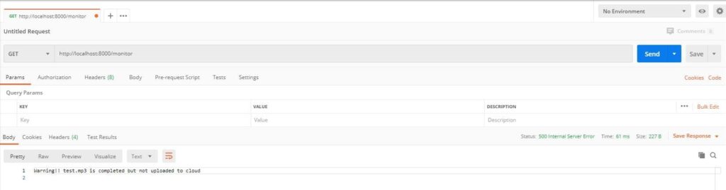 To receive an alert whenever completed file still exist in local server. Investigation must be made as to why this file is not uploaded to cloud storage. We can write a Go program to satisfy this need. The program can be integrated in availability check application such as Pingdom, Uptime Robot and Alertbot. We will returning status 500 when there is file exist in local directory and status 200 if everything is ok.